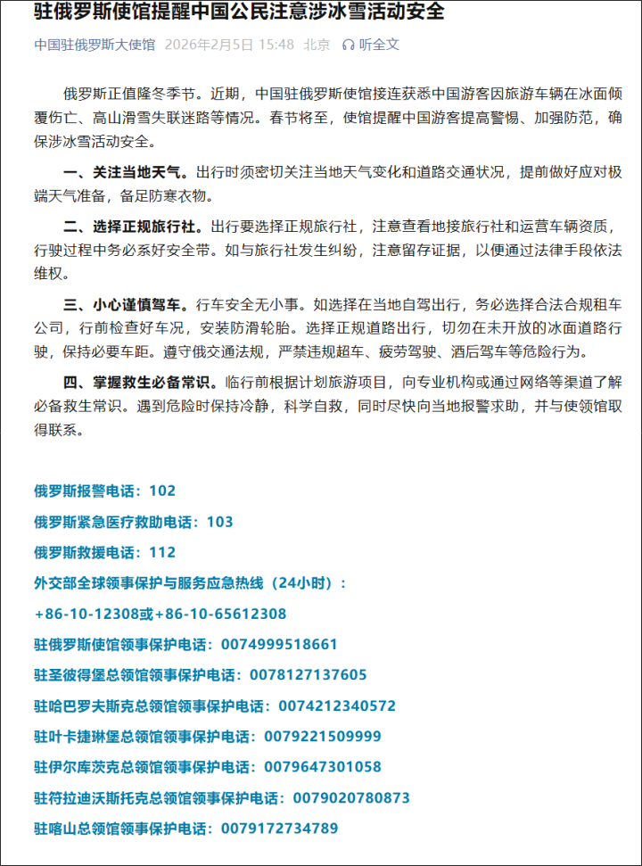 俄罗斯正值隆冬季节。近期,中国驻俄罗斯使馆接连获悉中国游客因旅游车辆在冰面倾覆伤亡、高山滑雪失联迷路等情况。春节将至,使馆提醒中国游客提高警惕、加强防范,确保涉冰雪活动安全。